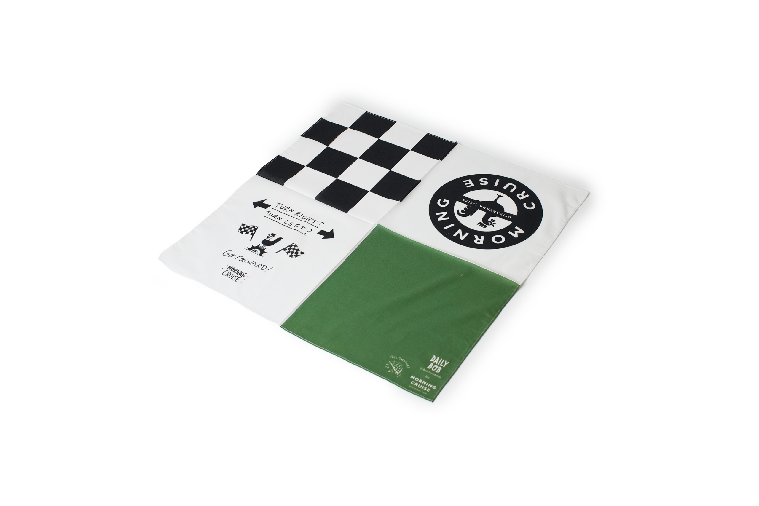 A unique collaboration piece from Daikanyama T-Site, home to the renowned Tsutaya Books Daikanyama. Morning Cruise teams up with BOB to create this beautifully designed checkered flag handkerchief, blending classic motorsport aesthetics with refined craftsmanship.