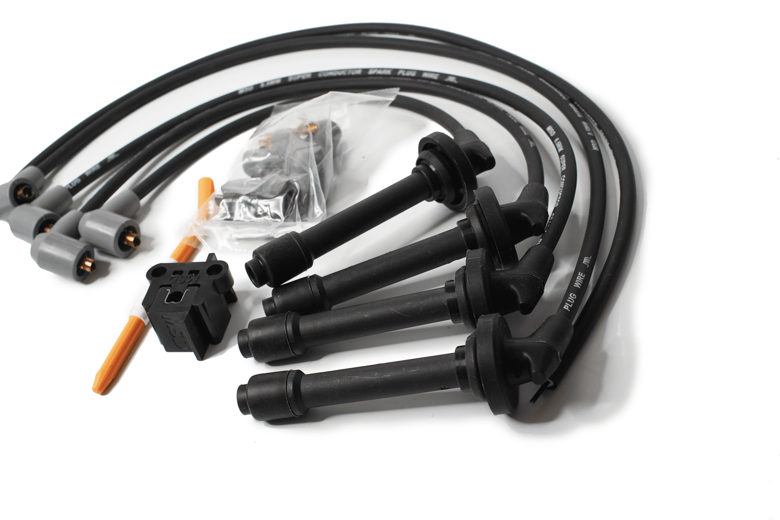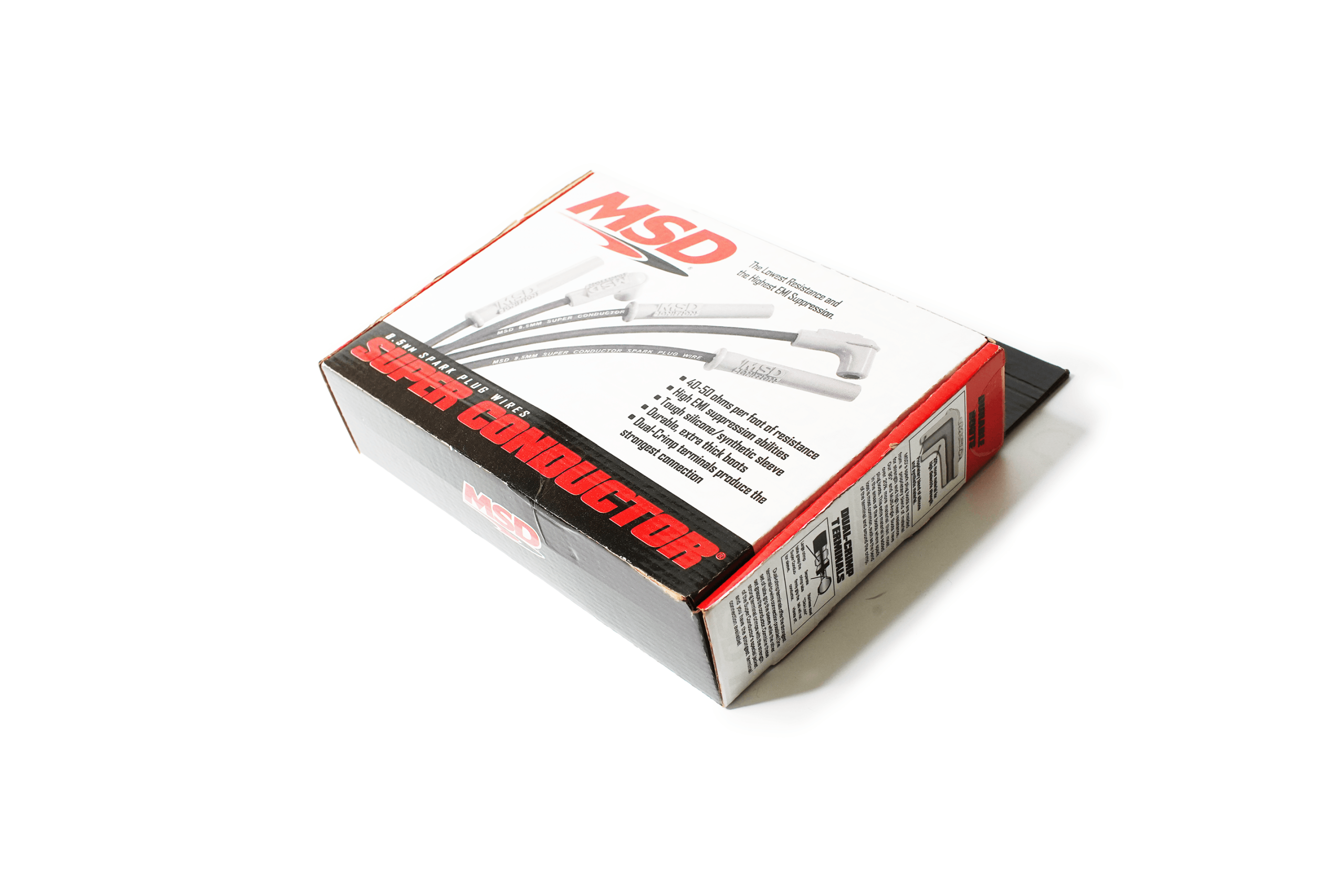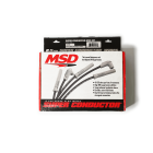 MSD 8.5mm Super Conductor spark plug wire sets feature a special helically wound core that has just 40-50 ohms of resistance per foot—but with an RFI suppression equal to a 1,500 ohm wire. In fact, each foot of finished wire includes 40 ft. of tightly wound copper for superior conductivity. This winding procedure, combined with a ferro-magnetic impregnated center core, produces an extremely effective Electro Magnetic Interference “choke.” This choke, or suppression capability, keeps the EMI inside the wire where it cannot interfere with other electronics on your vehicle. A tough, 8.5mm synthetic/silicone jacket over an extra-heavy glass braid and dielectric insulator keeps the current guided to the plugs. Underneath the high-temperature boots, dual crimp stainless steel terminals feature snap-locks to ensure a secure fit. Each set comes with clip-on cylinder markers for easy identification. MSD’s 8.5mm Super Conductor wire sets are available in custom or universal-fit applications, assembled or not, with a variety of terminal and boot end options.