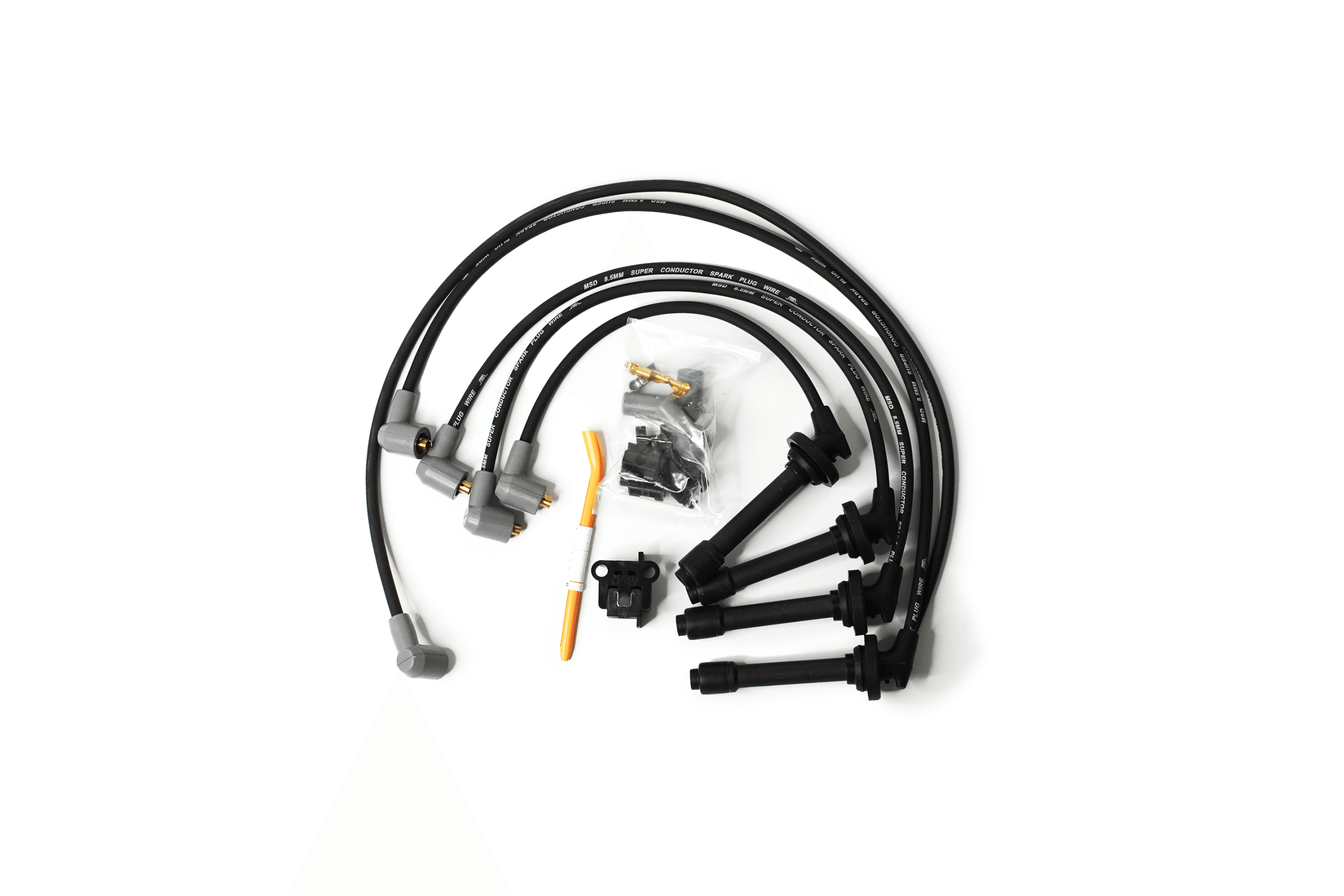 MSD 8.5mm Super Conductor spark plug wire sets feature a special helically wound core that has just 40-50 ohms of resistance per foot—but with an RFI suppression equal to a 1,500 ohm wire. In fact, each foot of finished wire includes 40 ft. of tightly wound copper for superior conductivity. This winding procedure, combined with a ferro-magnetic impregnated center core, produces an extremely effective Electro Magnetic Interference “choke.” This choke, or suppression capability, keeps the EMI inside the wire where it cannot interfere with other electronics on your vehicle. A tough, 8.5mm synthetic/silicone jacket over an extra-heavy glass braid and dielectric insulator keeps the current guided to the plugs. Underneath the high-temperature boots, dual crimp stainless steel terminals feature snap-locks to ensure a secure fit. Each set comes with clip-on cylinder markers for easy identification. MSD’s 8.5mm Super Conductor wire sets are available in custom or universal-fit applications, assembled or not, with a variety of terminal and boot end options.